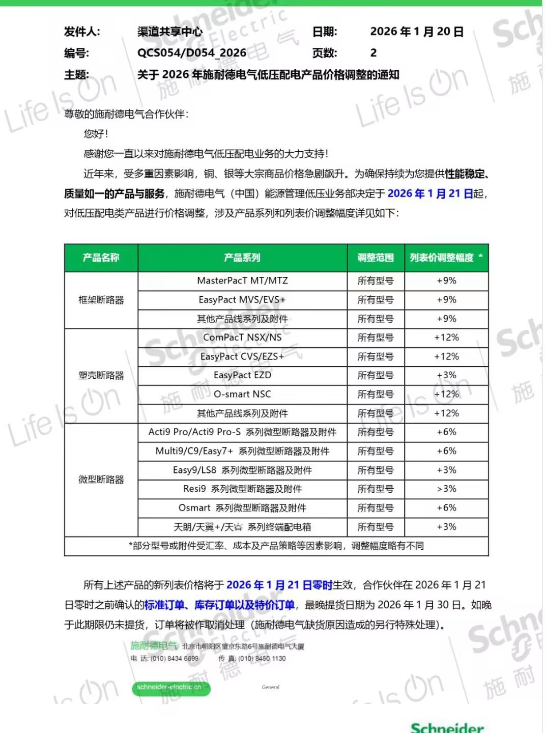 2026-1-21关于2026年施耐德电气低压配电产品价格调整的通知