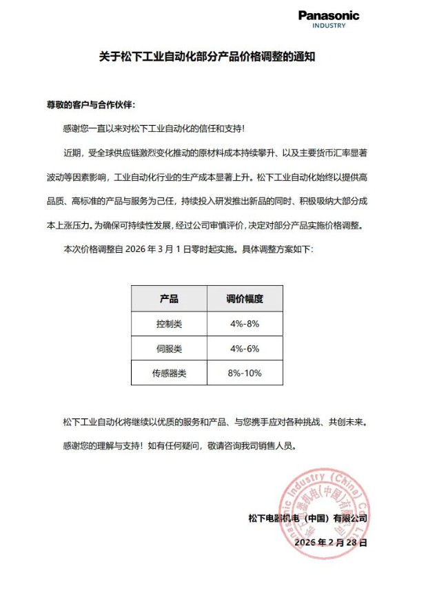 2026-3-1关于松下工业自动化部分产品价格调整的通知