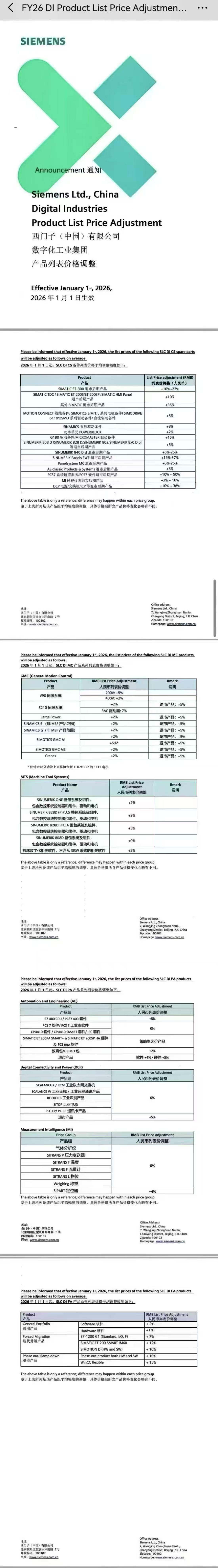 2026-1-1西门子(中国)有限公司数字化工业集团产品列表价格调整